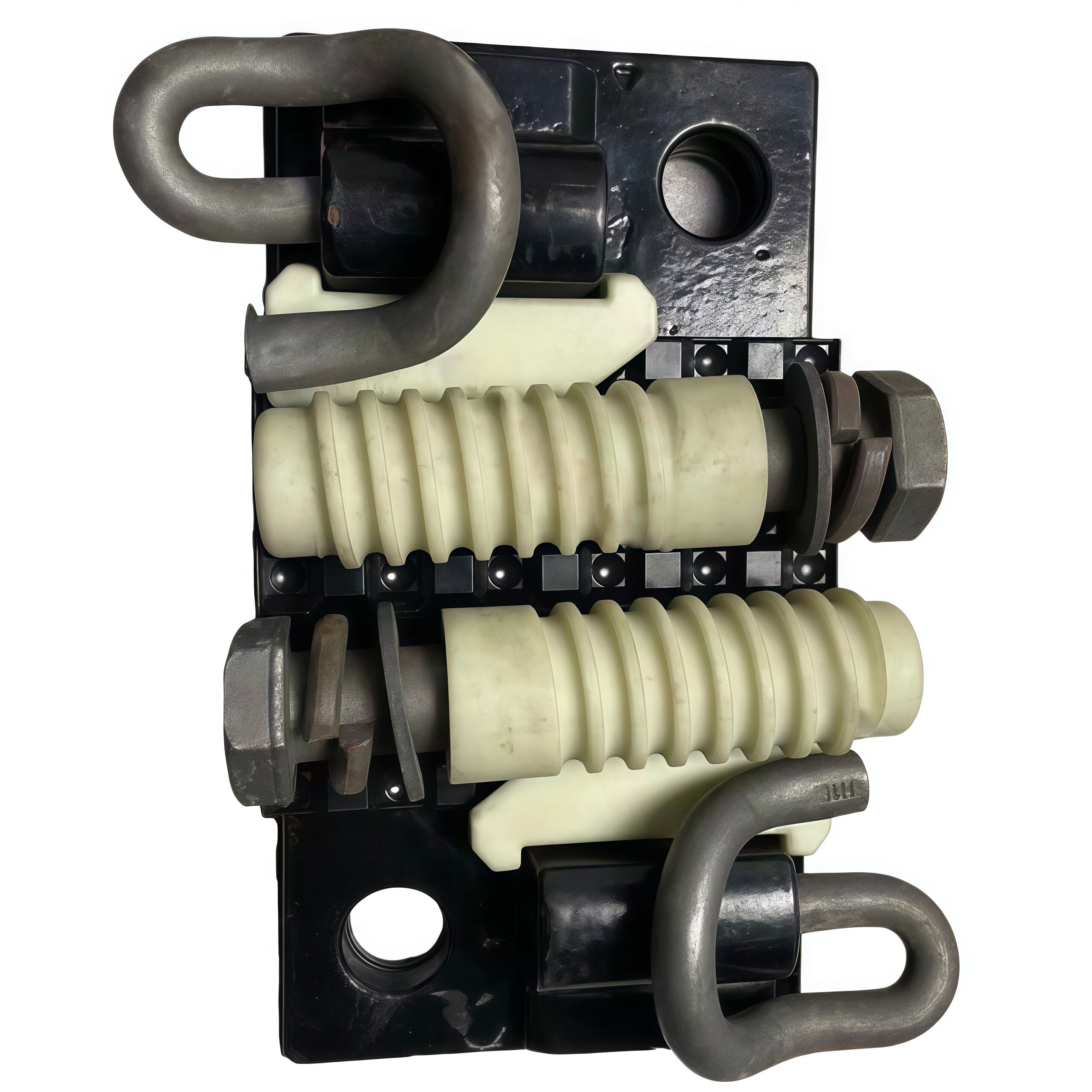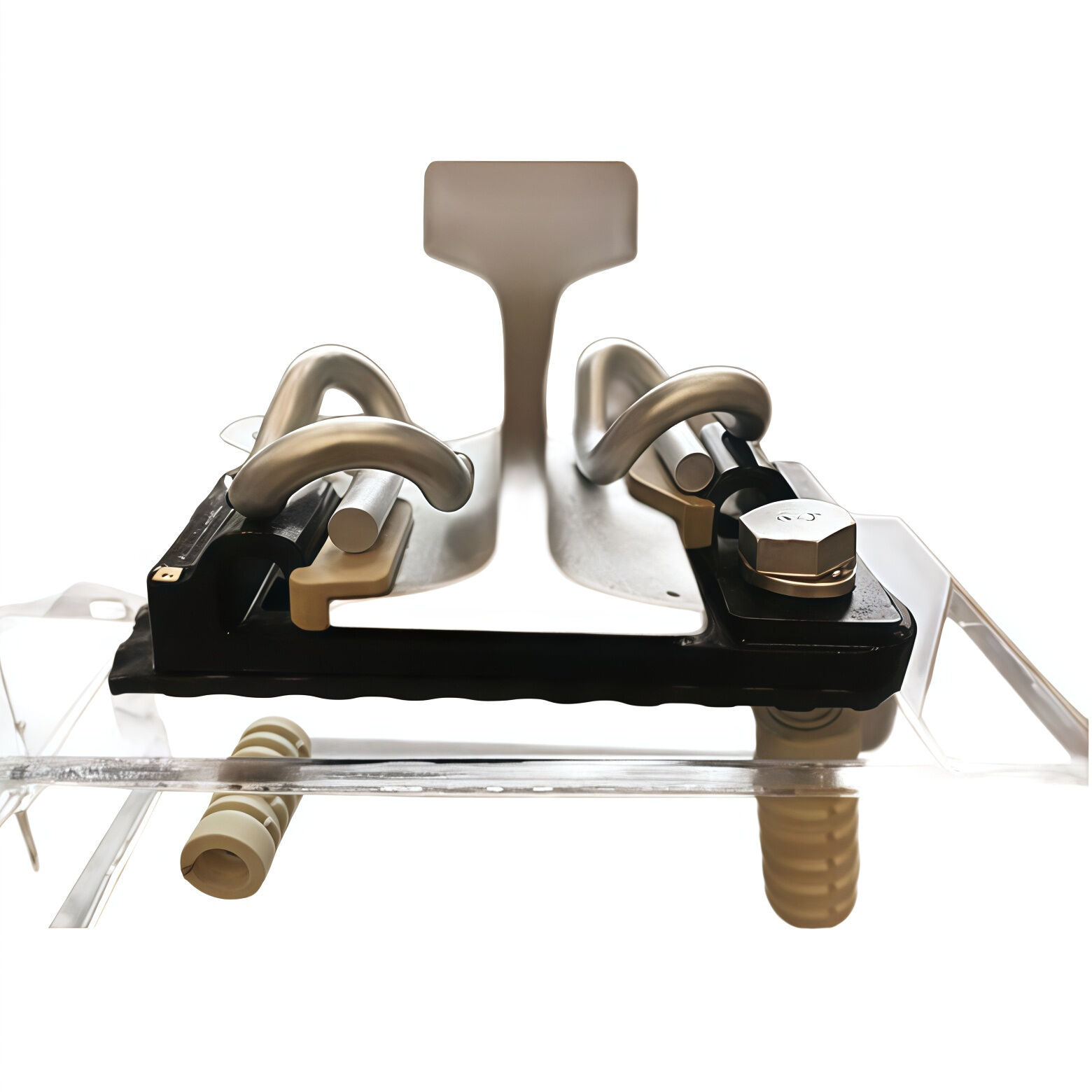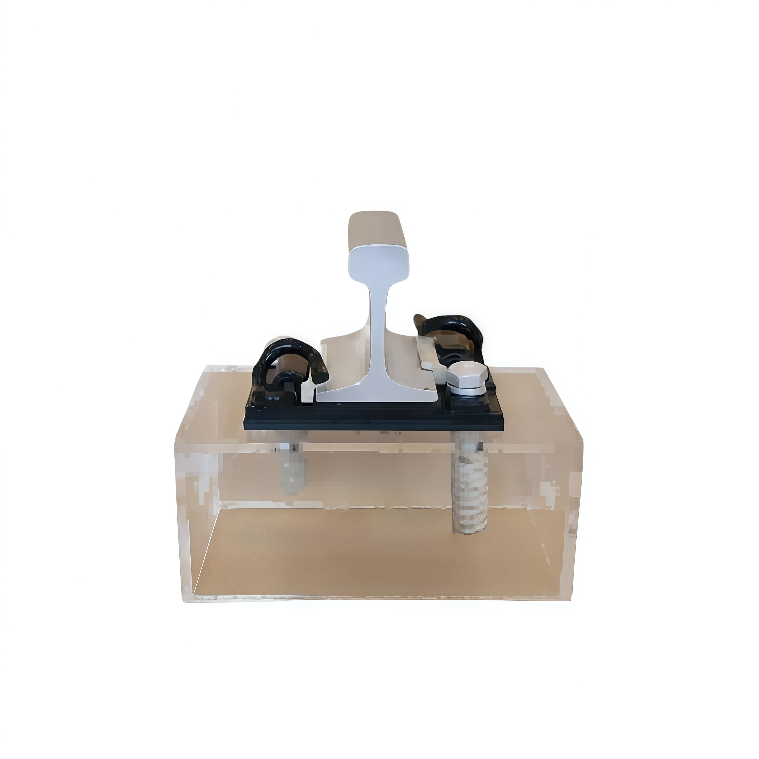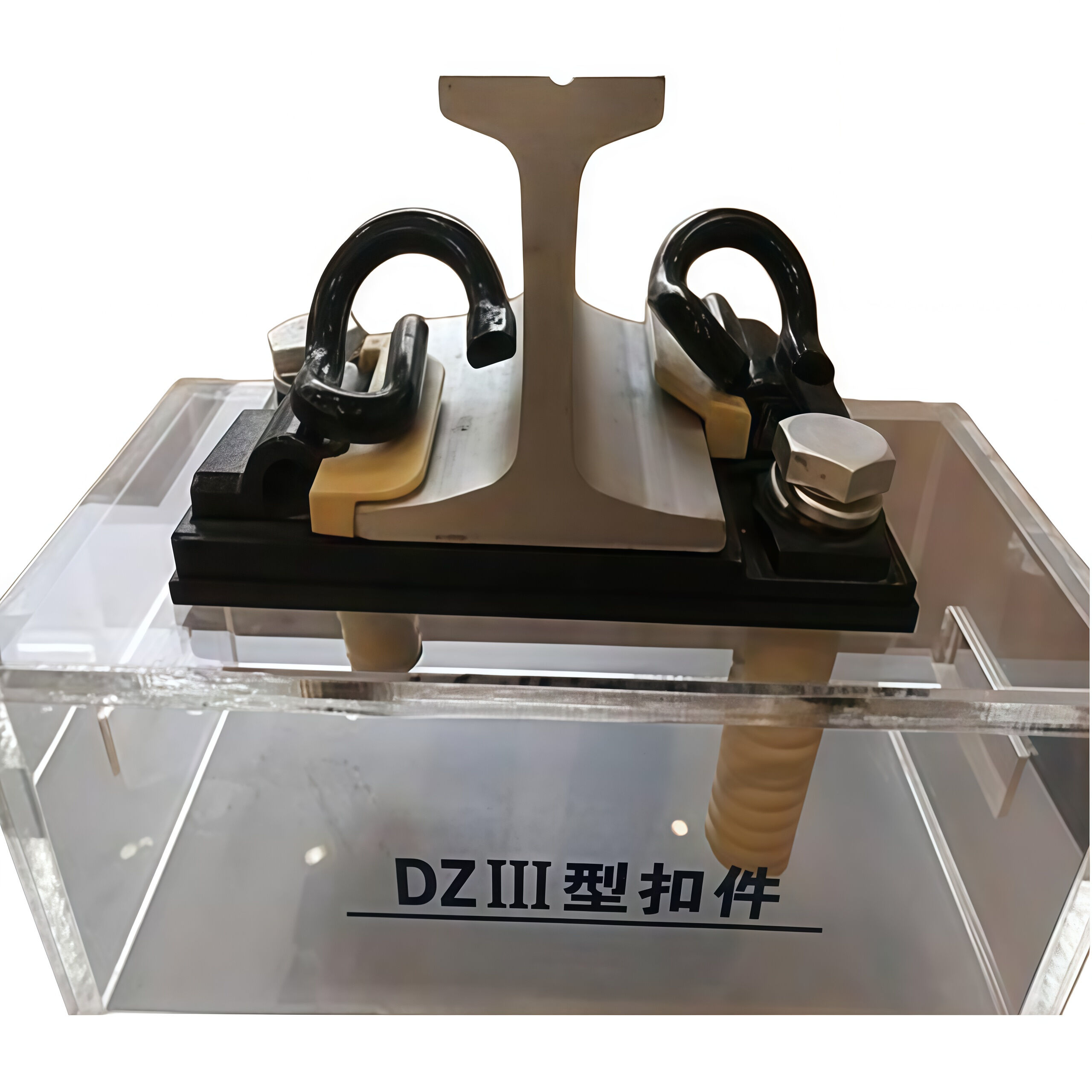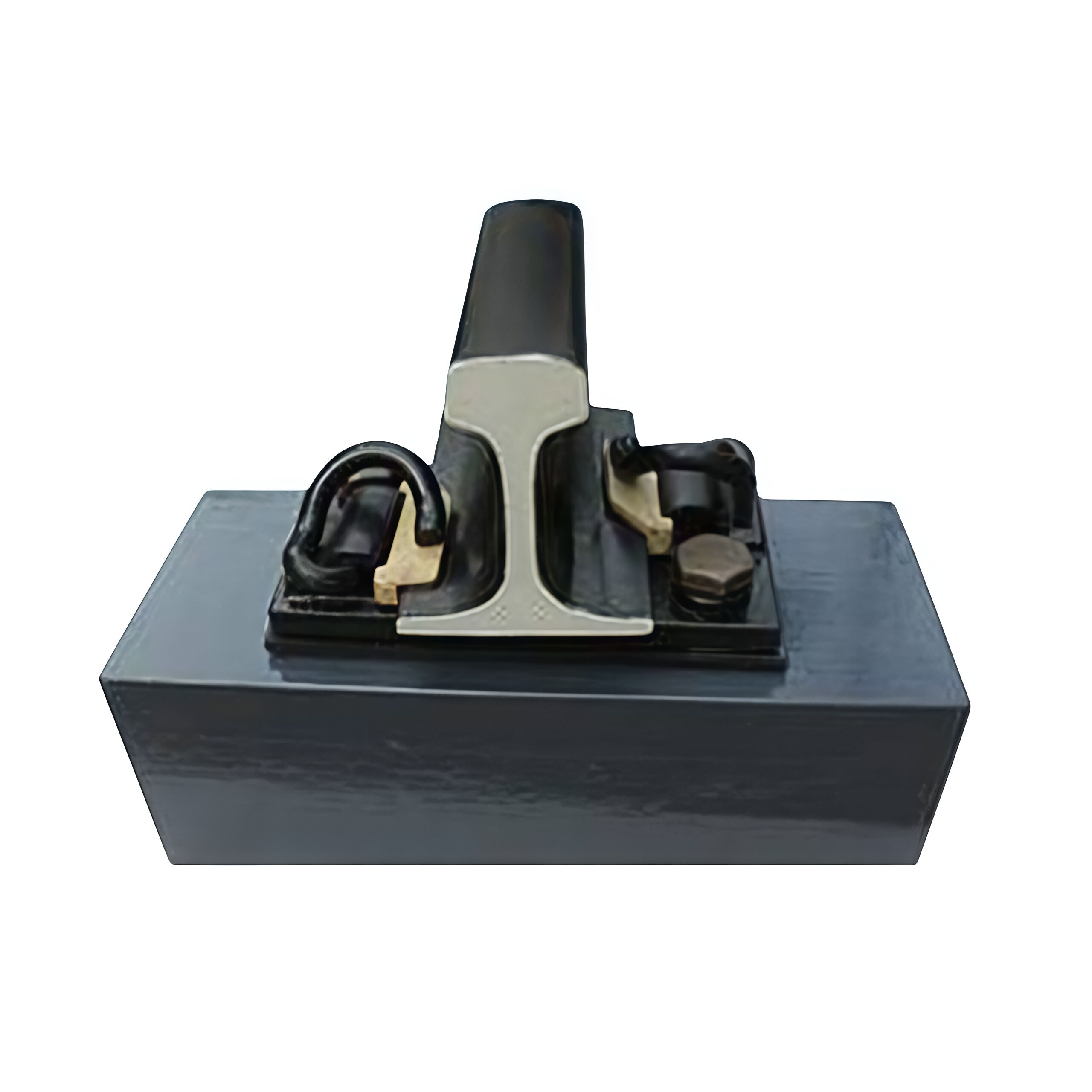 Een type III elastische balk wordt gebruikt om de rail en de ijzeren kussenplaat samen te bevestigen met T-bouten, en vervolgens wordt de ijzeren kussenplaat stevig verbonden met de betonnen fundering door middel van verankeringsbouten. De ijzeren kussenplaat is voorzien van een T-boutbasis en een schouderstopper. Draai de T-boutmoer aan om de veerbalkbevestiger aan te spannen en de verbindingsrail aan de ijzeren kussenplaat te bevestigen.